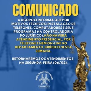 A UGOPOCI informa que por motivos técnicos (instalação de telefones, computadores e seus programas na controladoria do JURÍDICO),não haverá atendimento