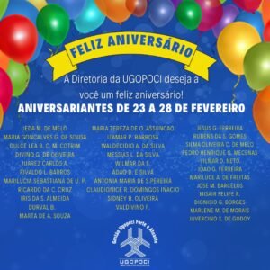 A UGOPOCI parabeniza todos os aniversariantes dos dias 23 a 28 de fevereiro. Muita paz, alegria, saúde e prosperidade!