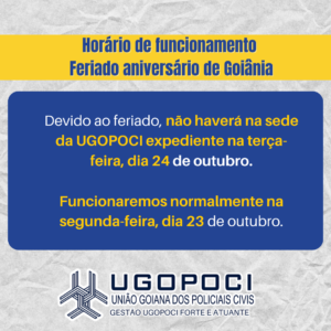 Dia 24 de outubro, terça-feira, comemora-se o aniversário de Goiânia, diante disso, não haverá expediente na sede da UGOPOCI. Já