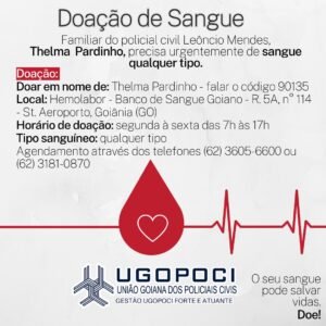 Paciente Thelma Pardinho, familiar do policial civil, Leôncio Mendes, necessita urgente de doação de sangue qualquer tipo. Código da paciente: