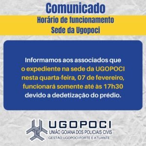 Informamos aos associados que o expediente na sede da UGOPOCI nesta quarta-feira, 07 de fevereiro, funcionará somente até às 17h30