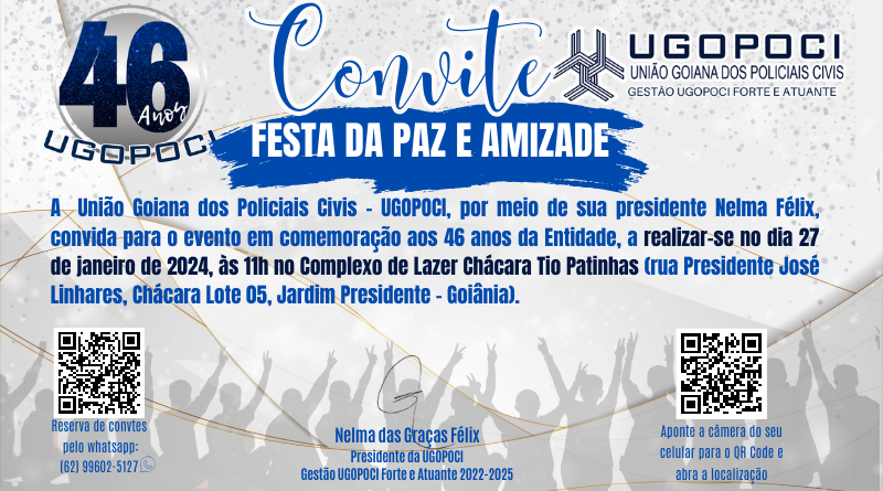 A diretoria da Ugopoci, através de sua presidente, Nelma Félix, convida todos os associados para a comemoração dos 46 anos da entidade que acontece no dia 27 de janeiro (sábado), às 11h na Chácara Tio Patinhas. 🎉 Para celebrar este momento, teremos show ao vivo e muita diversão!