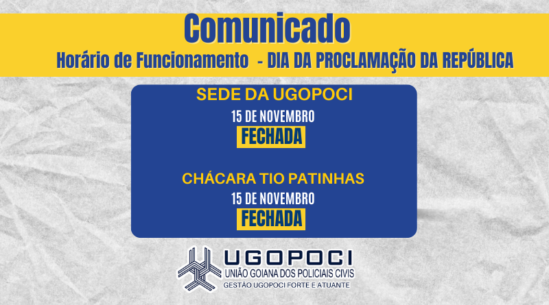 Devido ao feriado do Dia da Proclamação da República a sede da UGOPOCI, não abrirá, retornamos aos atendimento na quinta-feira (16), das 8h às 18h.