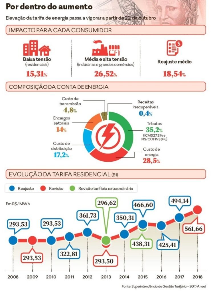 A Agência Nacional de Energia Elétrica (Aneel) aprovou ontem a revisão tarifária periódica – ajuste que ocorre a cada cinco anos – da Enel Distribuição Goiás, antiga Celg. Ficou definido que o consumidor goiano terá um aumento médio de 18,54% na conta de luz a partir do dia 22 de outubro, sendo que o inicialmente esperado e apresentado em audiência pública era de que o índice fosse de 15,72%.