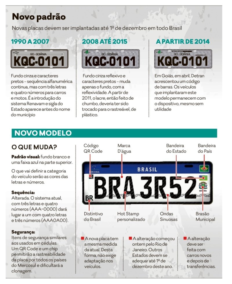 Será lançado nesta quarta-feira (12) o edital para a escolha das empresas que vão fabricar e estampar as placas veiculares em Goiás conforme o modelo Mercosul (veja quadro). Este assunto vem sendo discutido desde 2014, mas só agora o primeiro Estado deu início à alteração. O Rio de Janeiro começou nesta terça-feira (11) a emplacar os carros novos e realizar as transferências com as modificações. Goiás, assim como todos os demais Estados do País, tem até 1º de dezembro para realizar a mudança.