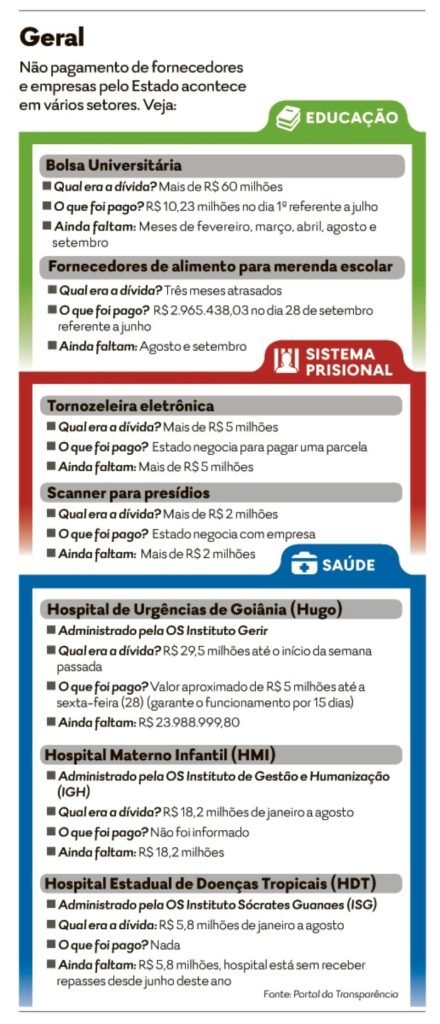 O Estado de Goiás mantém a dificuldade de pagar dívidas com fornecedores, empresas e organizações sociais. Apesar de repasses parciais que foram feitos na semana passada, os problemas continuam em áreas como segurança, educação e saúde, surgindo inclusive em novos locais. Reflexo disso é um aparelho que realiza exames de doenças hepáticas parado no Hospital de Doenças Tropicais Dr. Anuar Auad (HDT) há mais de um mês por falta de dinheiro para fazer a devida manutenção e a ameaça da paralisação do serviço de monitoramento de tornozeleiras eletrônicas de 4 mil presos a partir da tarde desta quarta-feira (3).