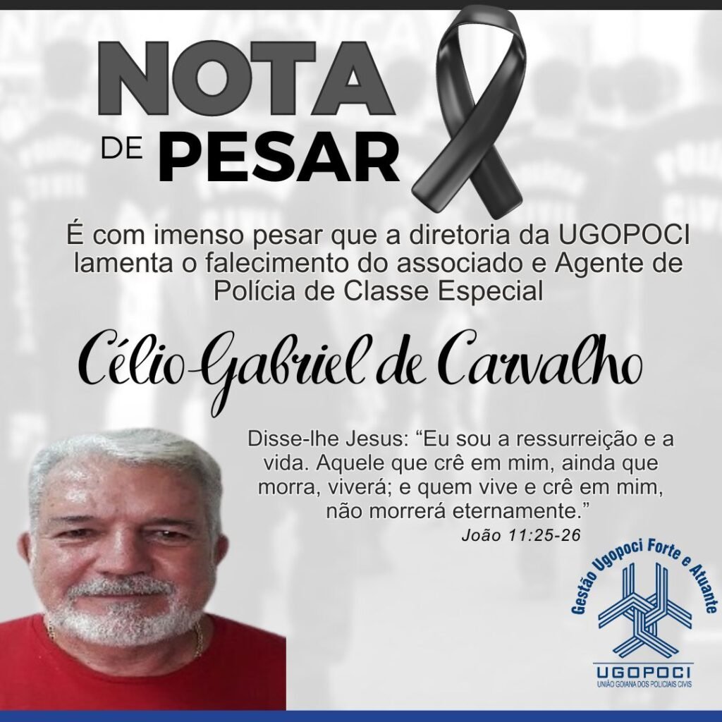 É com imenso pesar que a diretoria da União Goiana dos Policiais Civis – UGOPOCI lamenta o falecimento do associado e Agente de Polícia de classe especial, CÉLIO GABRIEL DE CARVALHO.