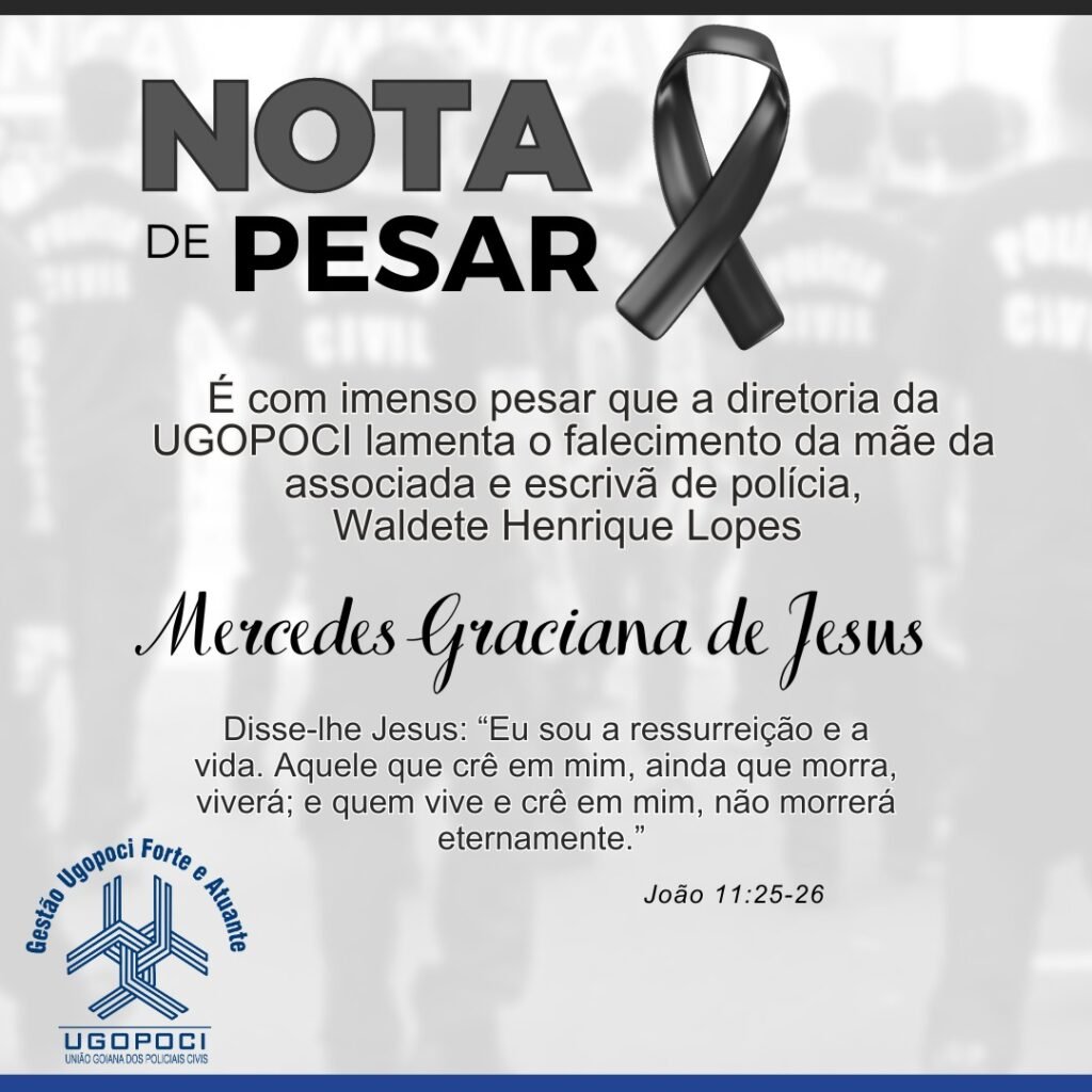 É com imenso pesar que a diretoria da] União Goiana dos Policiais Civis – UGOPOCI lamenta o falecimento de MERCEDES GRACIANA DE JESUS, mãe da associada e escrivã de polícia, Waldete Henrique Lopes.