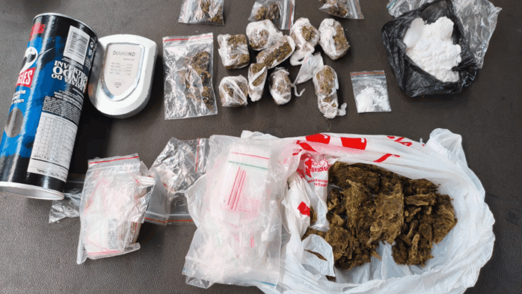 Foram apreendidas porções de maconha e cocaína, embalagens tipo zip lock e uma balança de precisão, além das substâncias encontradas na sacola: 14 porções pequenas de maconha, 1 porção maior de maconha e porções de cocaína. O suspeito foi autuado em flagrante.