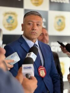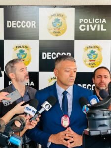 A Polícia Civil de Goiás, por meio da Delegacia Estadual de Combate à Corrupção (Deccor), apresentou, em coletiva de imprensa nesta quinta-feira (21), um balanço da Operação Endrôminas. A operação foi deflagrada ontem e as diligências se estenderam até meados da tarde, com apreensão de documentos e eletrônicos. A operação cumpriu 32 mandados de busca e apreensão em residências e em vários órgãos públicos. Investigação apura suposto esquema de fraudes a licitações e outros delitos contra a administração pública municipal de Goiânia. O delegado titular da Deccor, Francisco Lipari, explicou o esquema criminoso. Participaram também da coletiva o delegado Marcelo Aires, chefe de polícia judiciária, e o delegado Rodrigo Mendes, gerente de planejamento operacional.