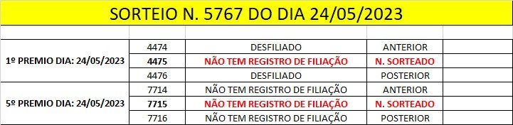 O sorteio da Loteria Federal de quarta-feira (24/05) do concurso nº 5767, não teve ganhador nem o número exato sorteado, nem os seus antecessores e posteriores, pois os mesmos eram desfiliados ou não havia registro de filiação como mostra a imagem em seguida.