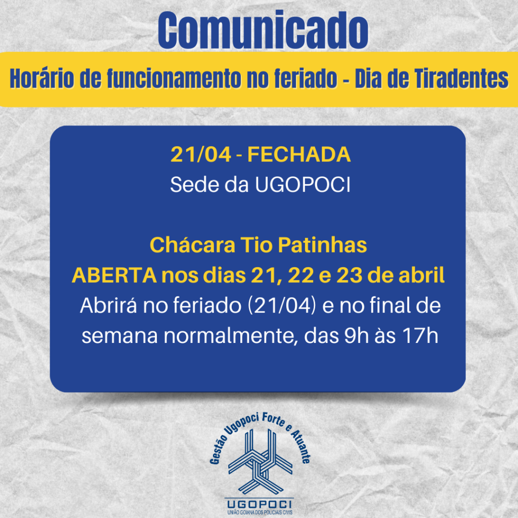 Atenção para o nosso horário de funcionamento neste feriado! No dia 21 de abril a sede da entidade estará fechada, porém o clube da UGOPOCI estará aberto, aproveite!