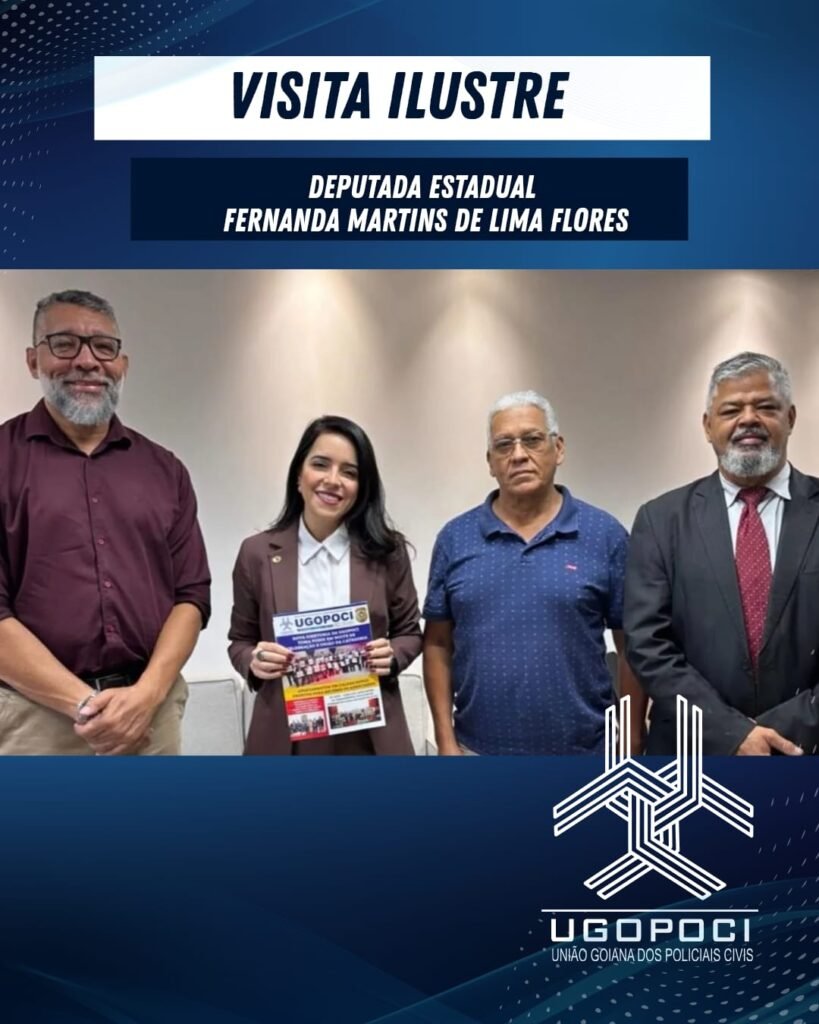 No dia 29 de setembro de 2025, a convite do Diretor Financeiro da UGOPOCI, Sr. Antônio Elias Cardoso, a diretoria da entidade teve a honra e a satisfação de realizar uma visita de cordialidade à deputada estadual Fernanda Martins de Lima Flores (Solidariedade), em seu gabinete na Assembleia Legislativa do Estado de Goiás (ALEGO).