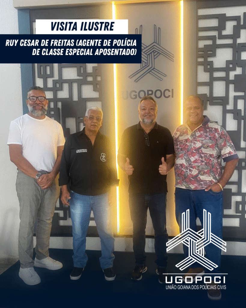 VISITA ILUSTRE | Na manhã desta quinta-feira, 05, a diretoria da Ugopoci recebeu, com muito carinho, a visita ilustre do associado Ruy Cesar de Freitas, agente de polícia de classe especial aposentado. Ele foi recebido pelo secretário geral, Antônio Carlos, o diretor de finanças, Antônio Elias, e o diretor administrativo, Mircinon. É uma honra recebê-lo em nossa entidade, seja sempre bem-vindo.